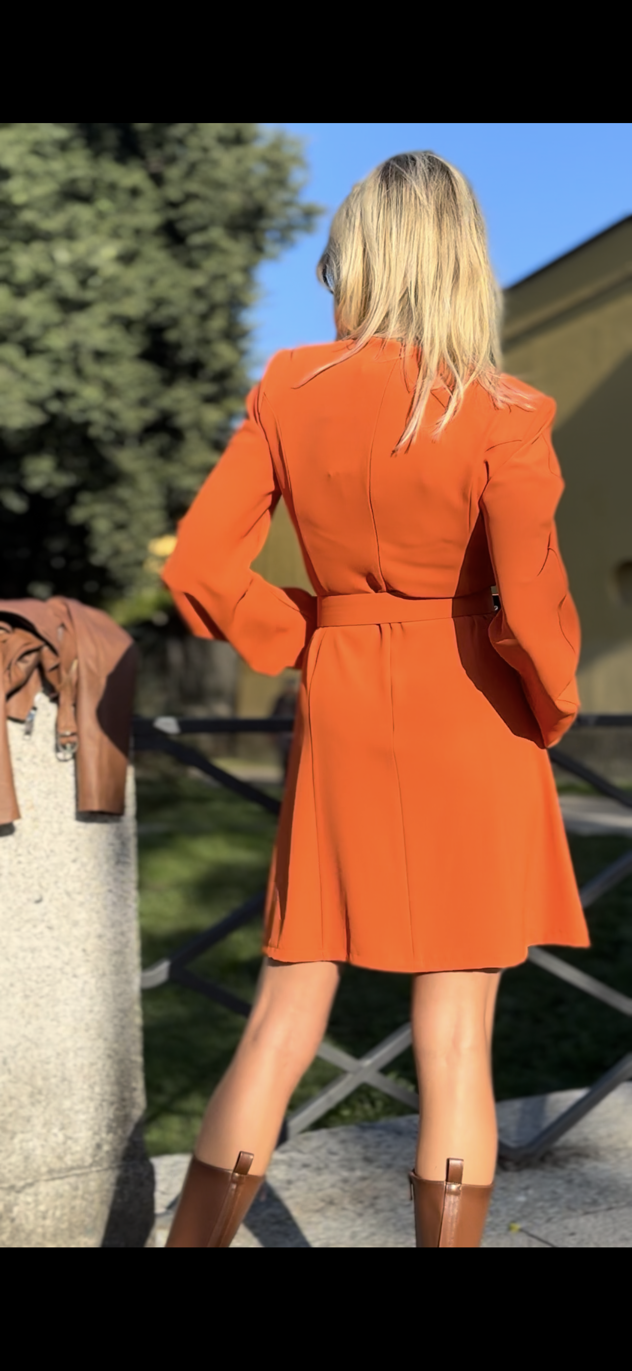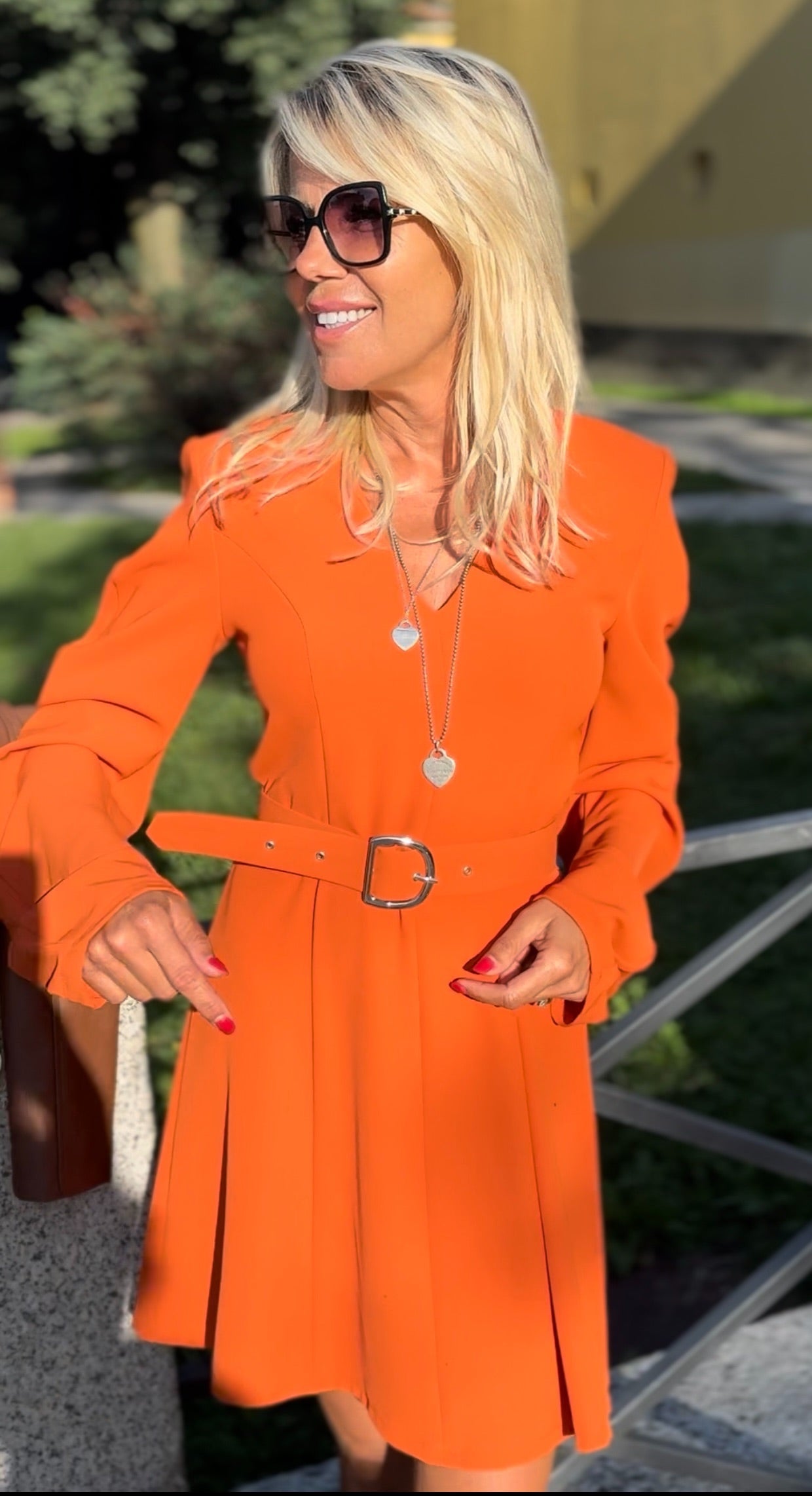 Abito corto dal taglio deciso. La scollatura a v assieme alle maniche lunghe e leggermente drappeggiate aggiungono un tocco sofisticato, mentre la cintura in vita valorizza la silhouette.
