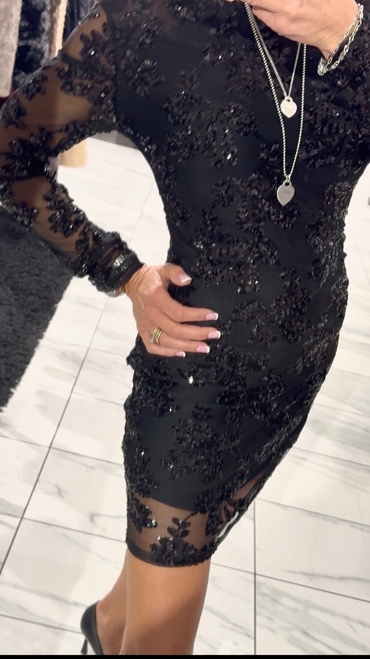 Tubino elasticizzato con maniche e fondo gonna trasparenti con applicazione di paillettes