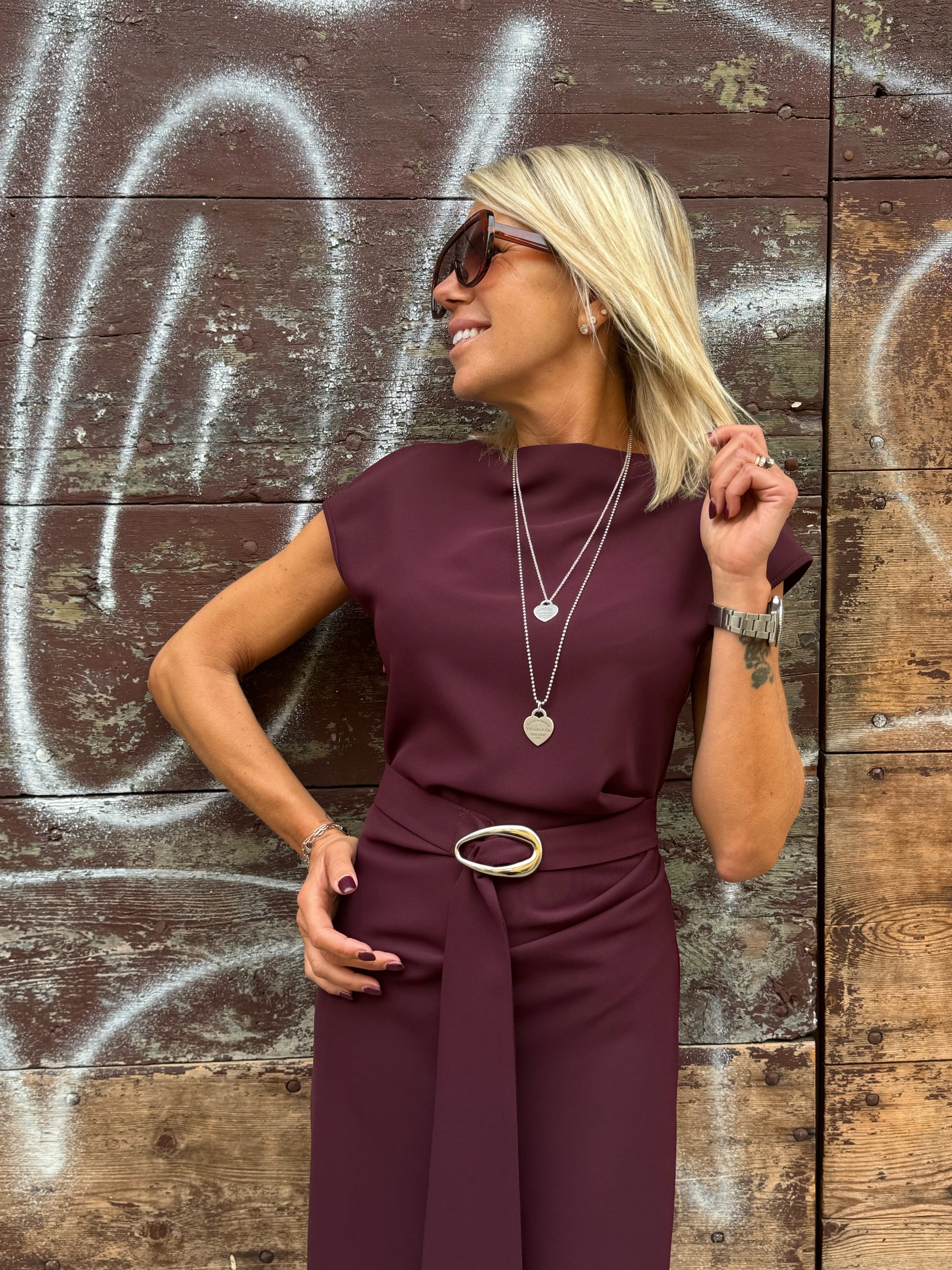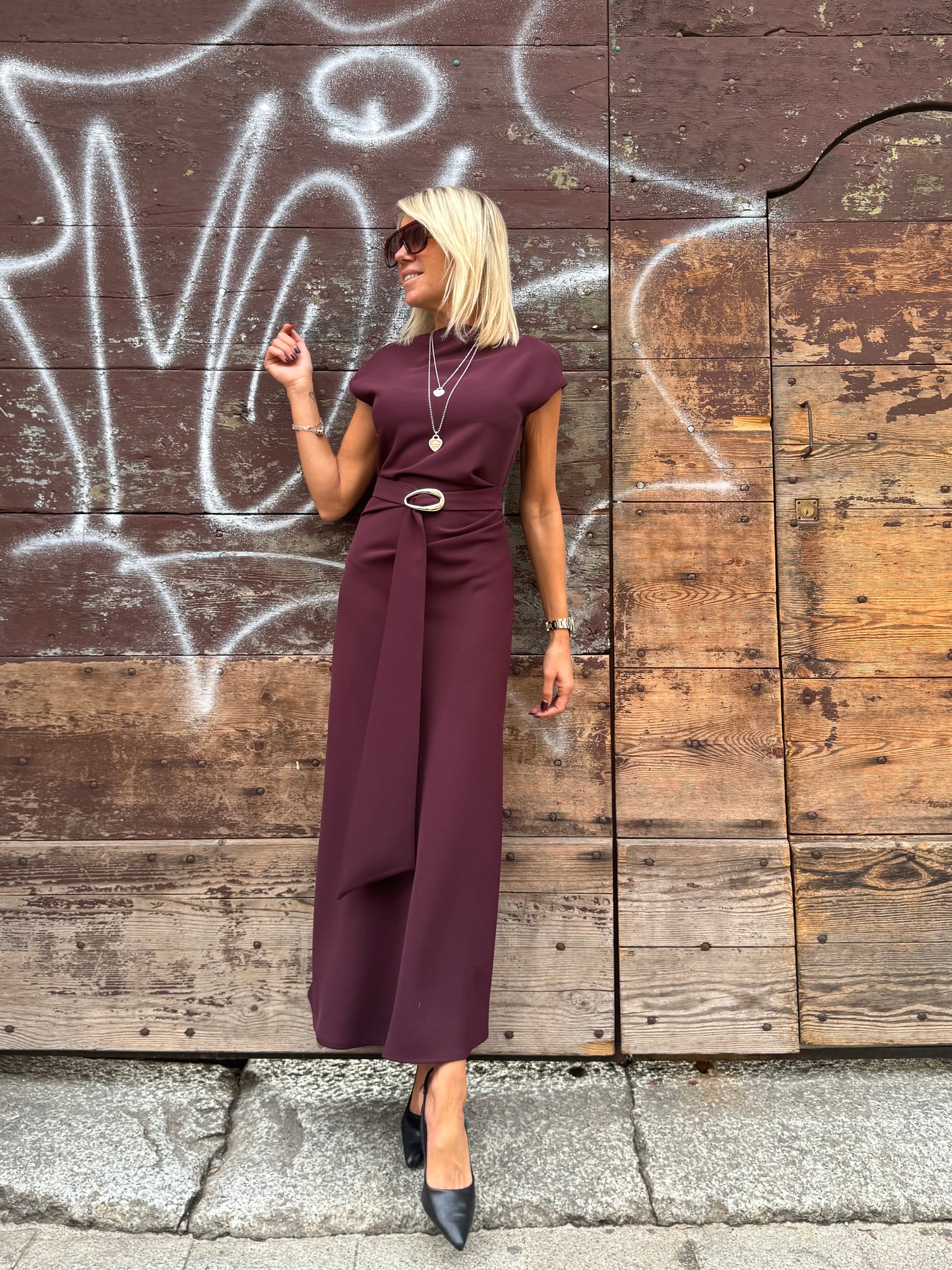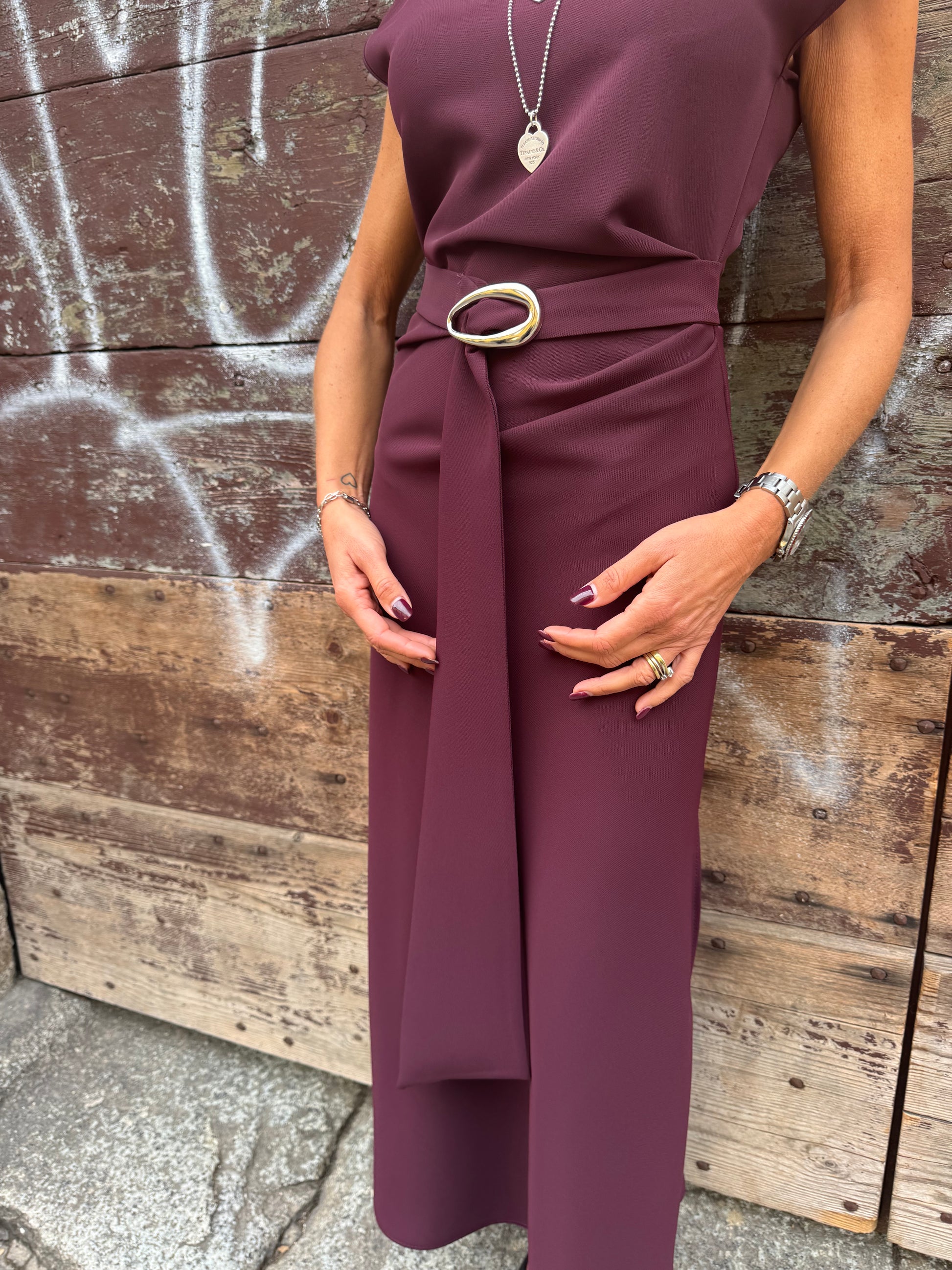 Abito lungo senza maniche abbinato a un scollo asimmetrico e una cintura in vita aggiunge un tocco di classe e raffinatezza. Perfetto per chi cerca un look distintivo che esprime individualità e buon gusto.