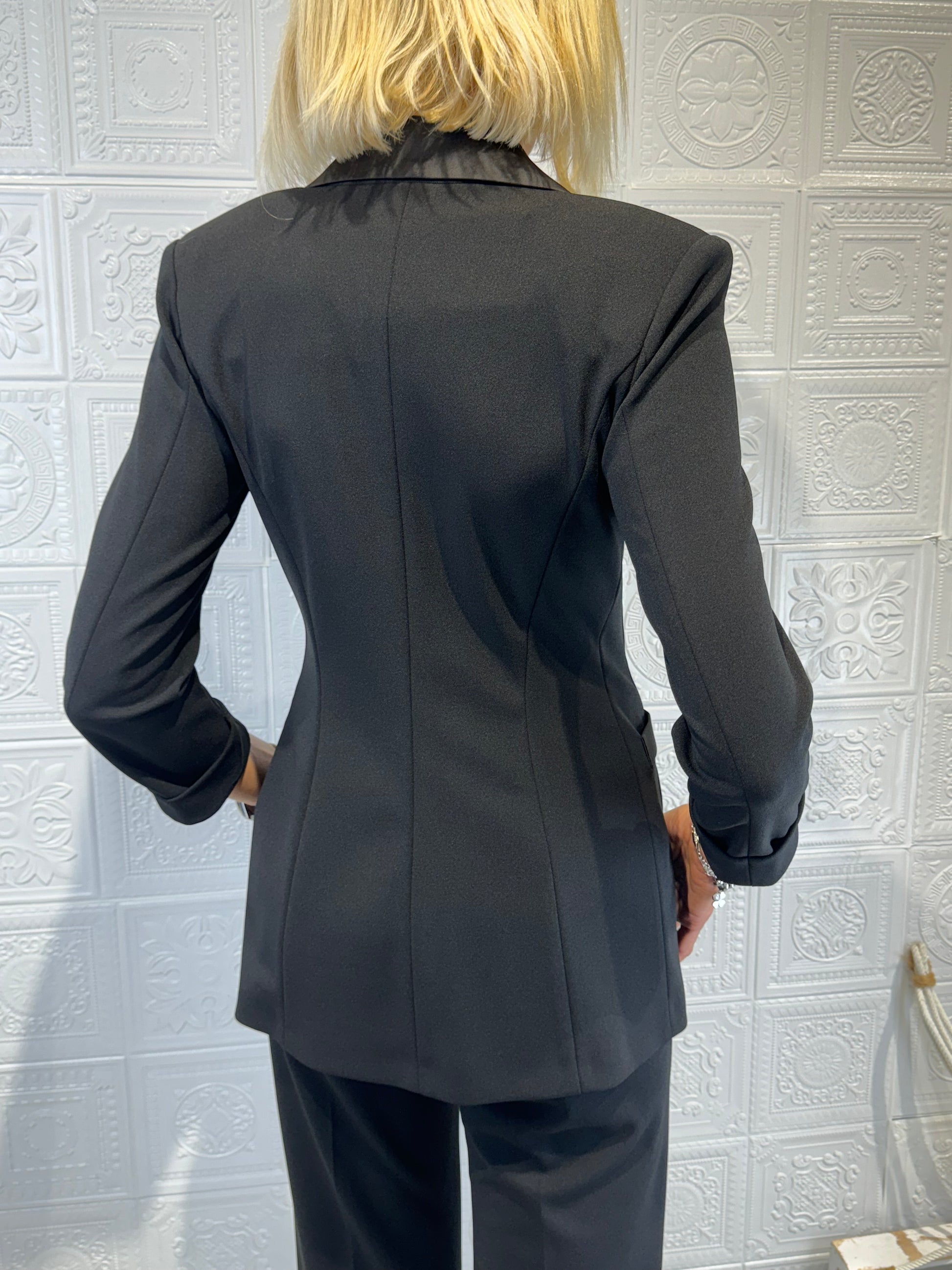 Blazer doppiopetto tinta unita, caratterizzato da revers a lancia e tasche a filetto, maniche 3/4, profili e bottoni in raso. Tessuto elasticizzato per una vestibilità perfetta, è il capo ideale per chi cerca uno stile sofisticato e contemporaneo. Perfetto per dare un tocco di classe a qualsiasi outfit.