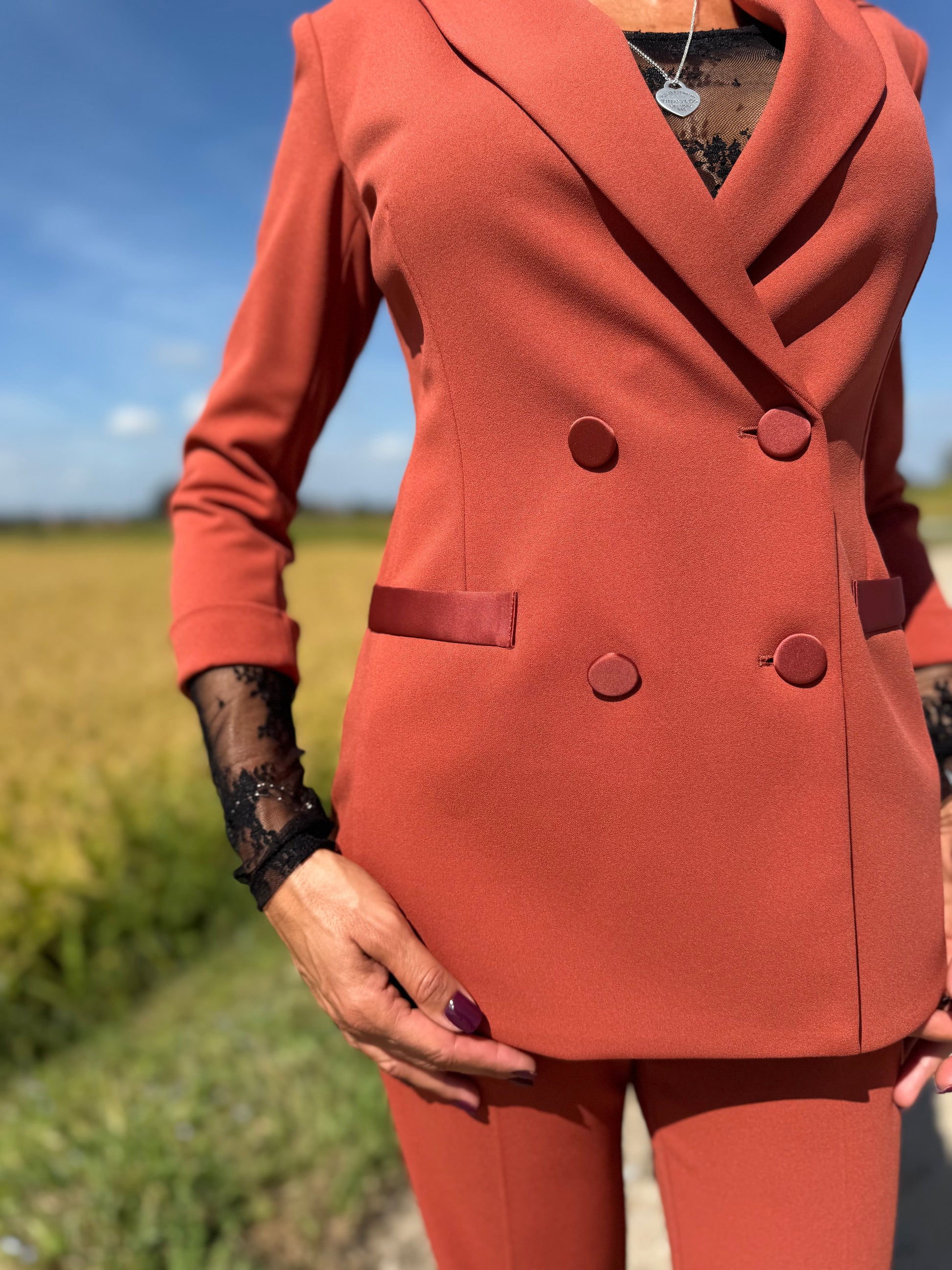 Blazer doppiopetto tinta unita, caratterizzato da revers a lancia e tasche a filetto, maniche 3/4, profili e bottoni in raso. Tessuto elasticizzato per una vestibilità perfetta, è il capo ideale per chi cerca uno stile sofisticato e contemporaneo. Perfetto per dare un tocco di classe a qualsiasi outfit.