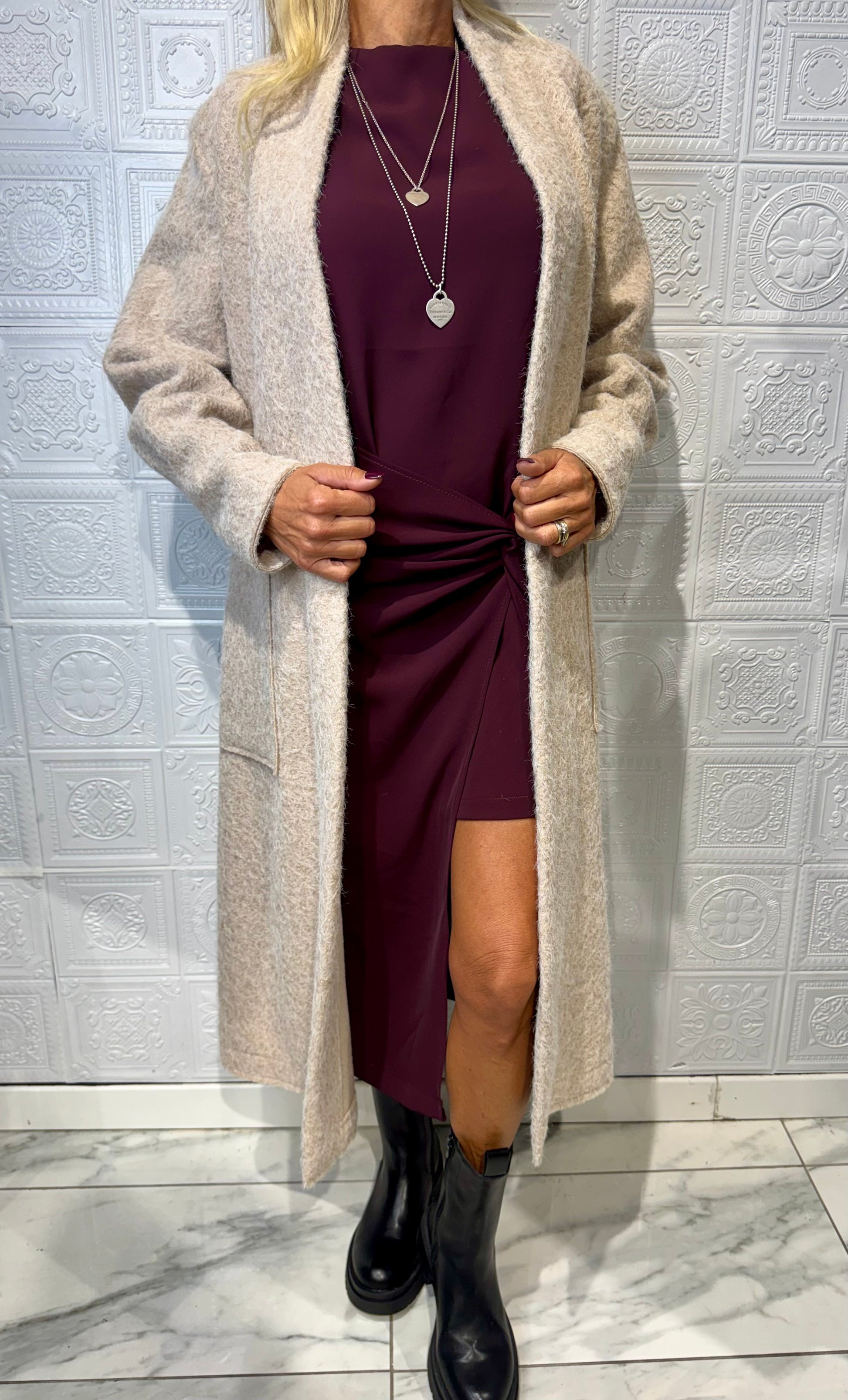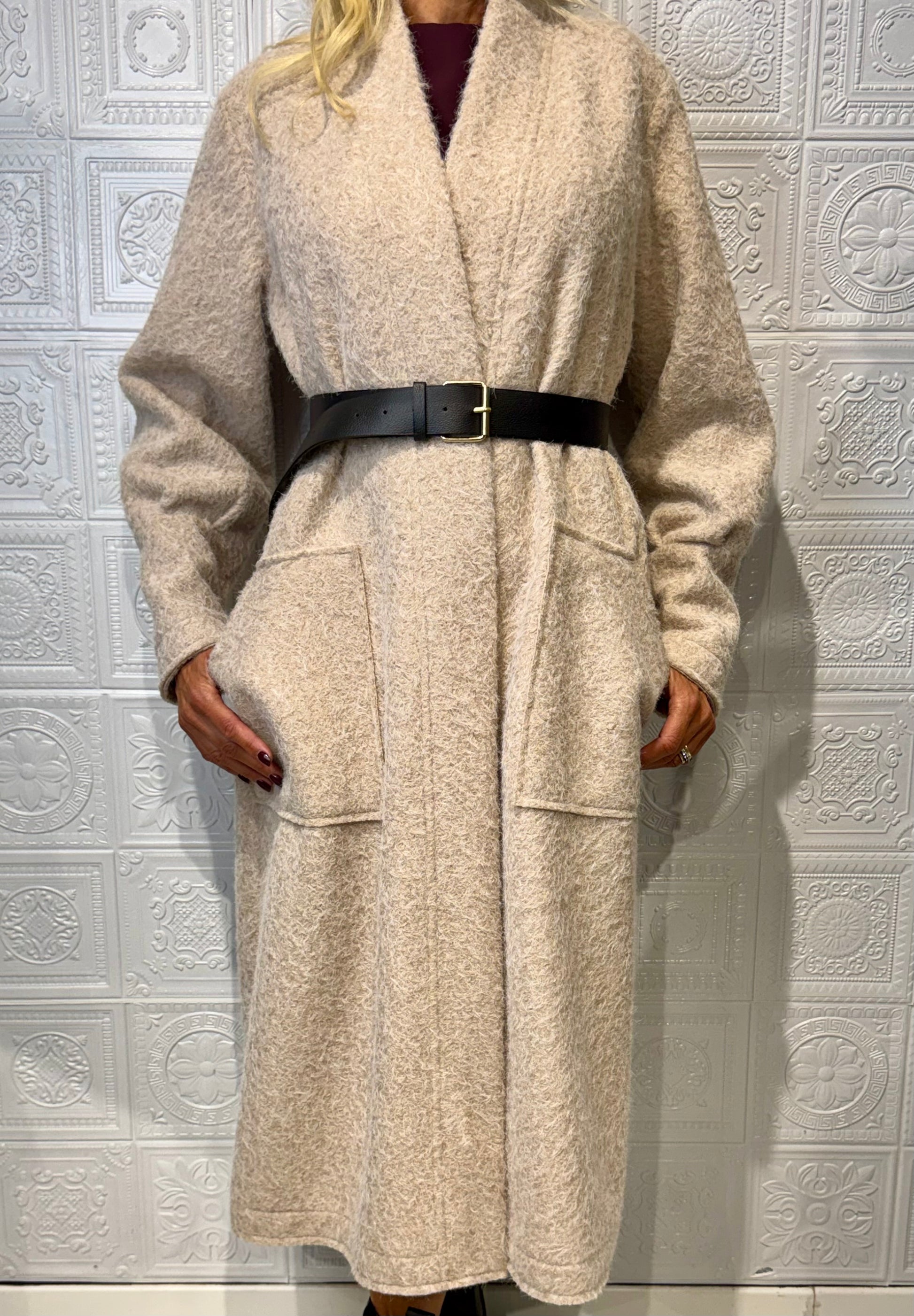 Cappotto comodo con passanti in vita, cintura già compresa e tasche sul davanti.