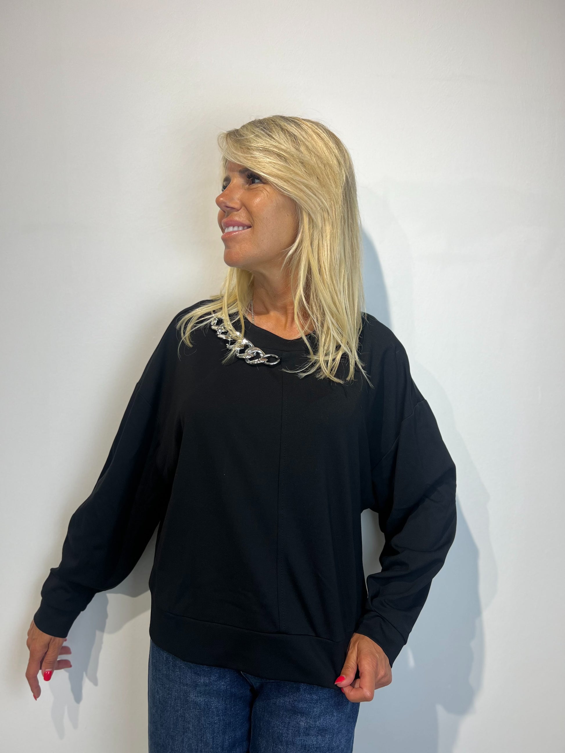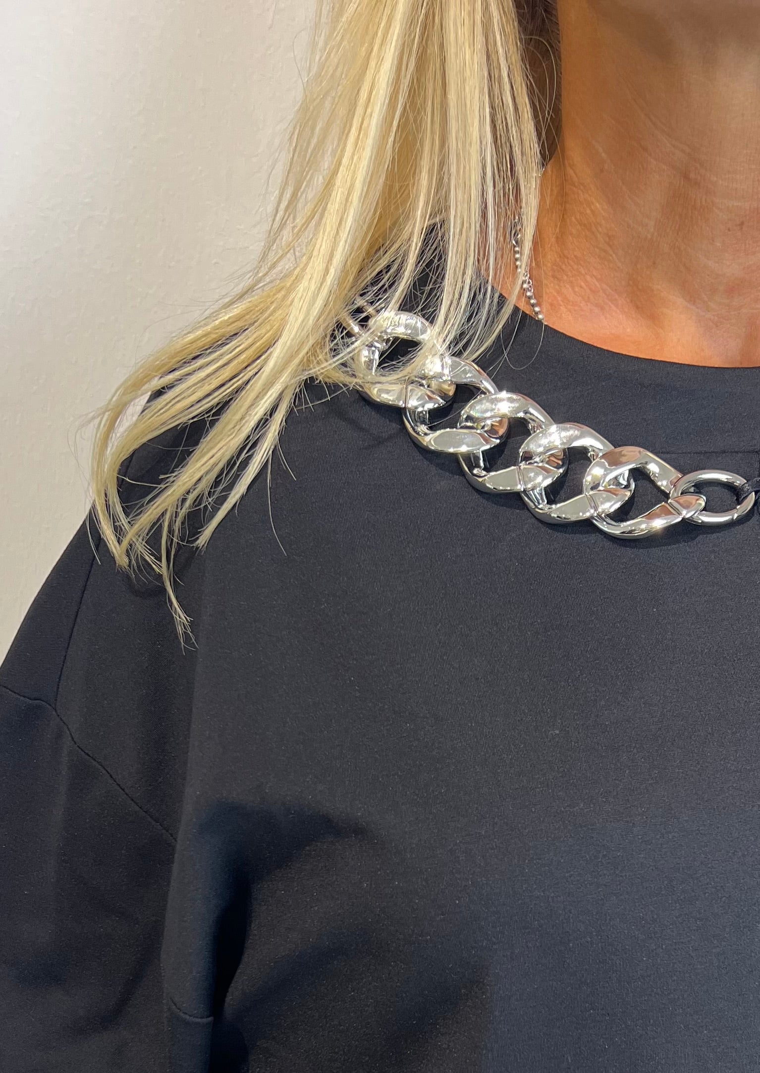 Felpa dalla vestibilità ampia, chiusura con bottone sul retro e catena removibile sul collo