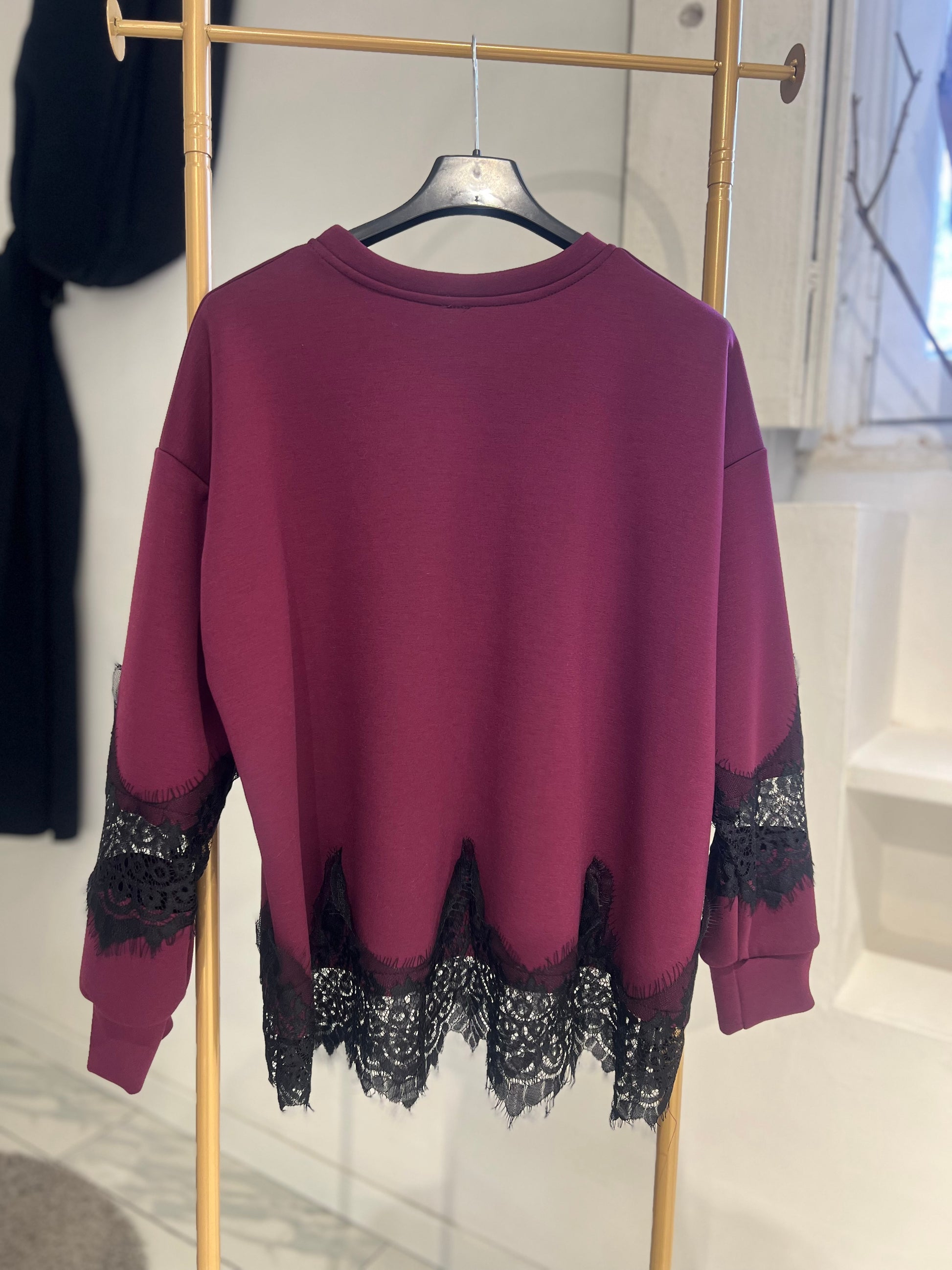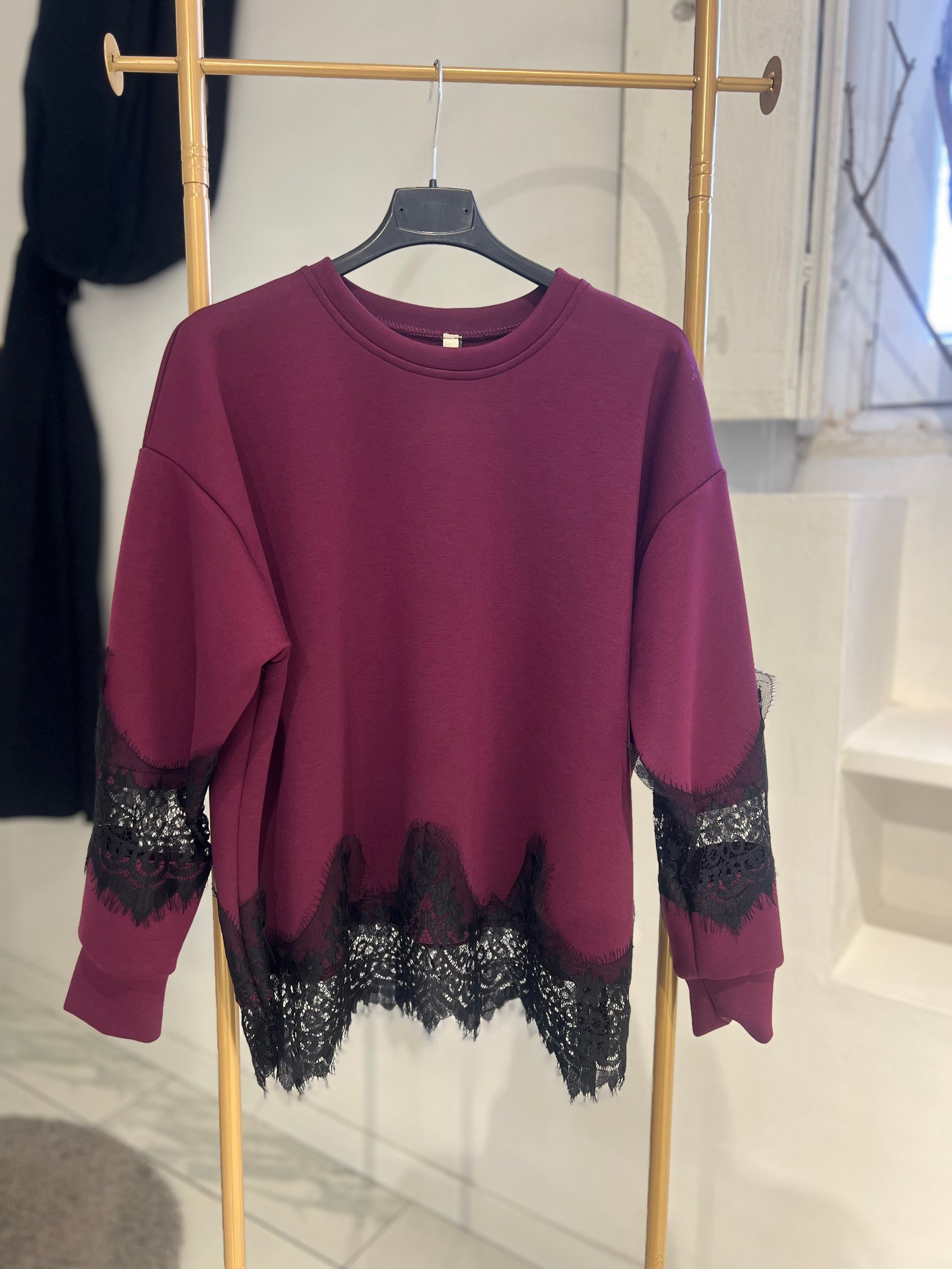 Morbidissima felpa girocollo con inserti in pizzo sulle maniche e sul fondo