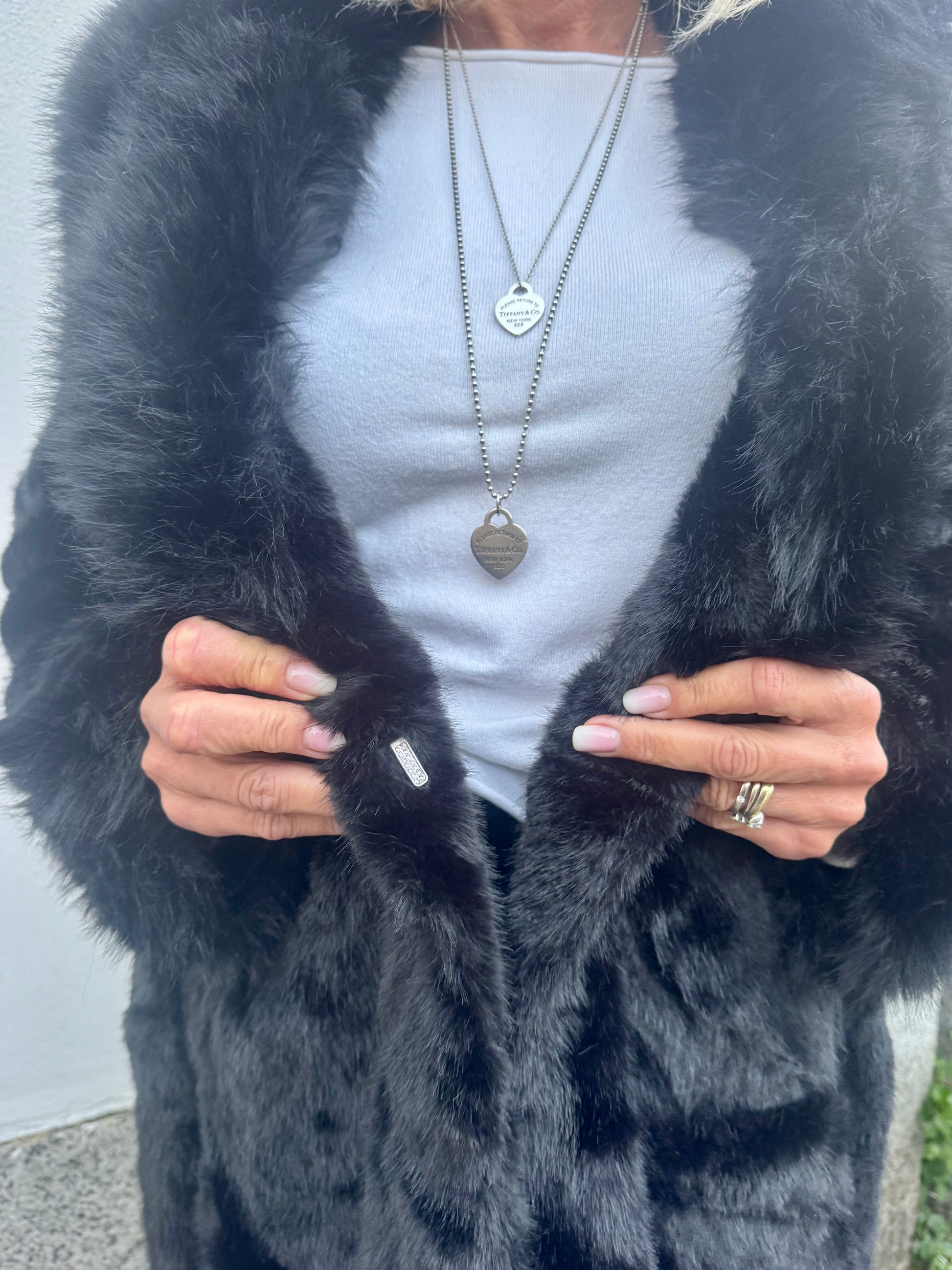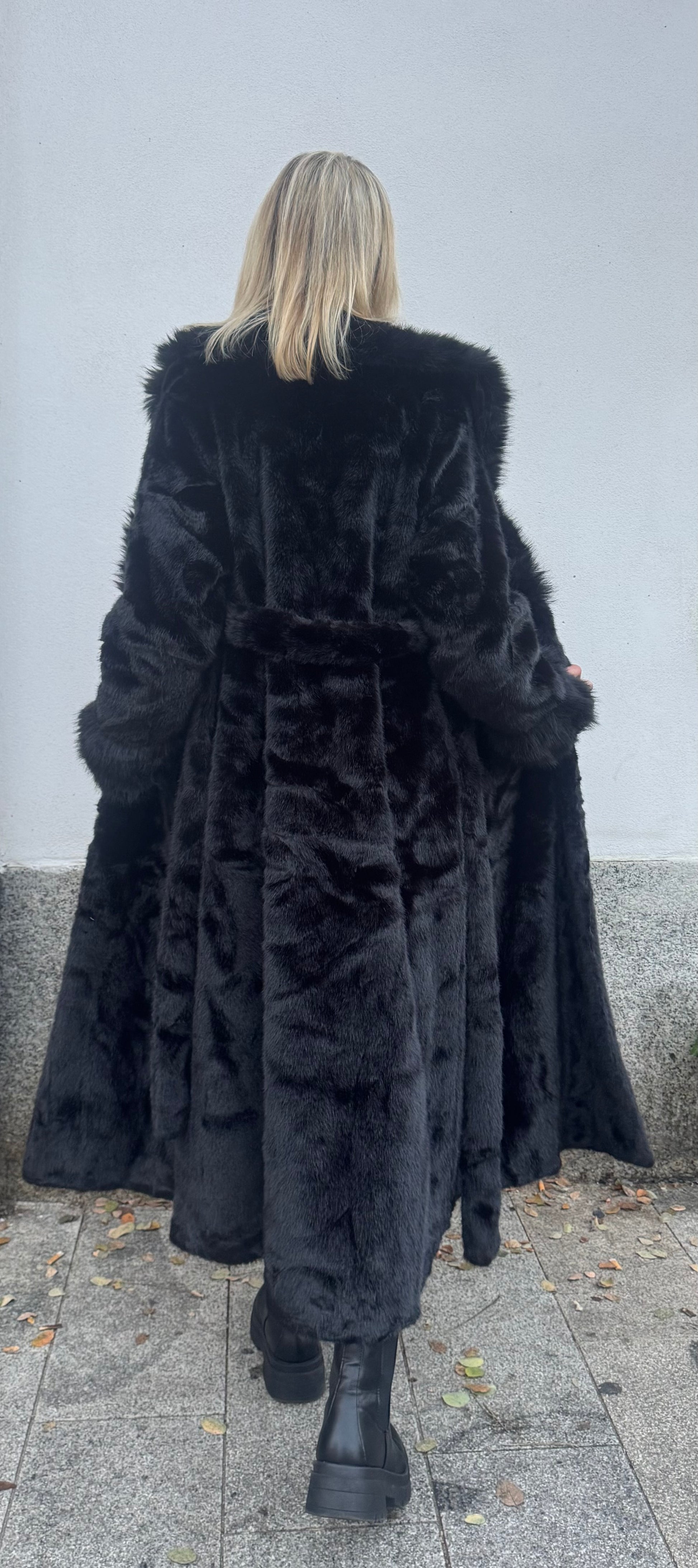 Ecopelliccia modello lungo e ampio, chiusura con ganci, cintura in vita