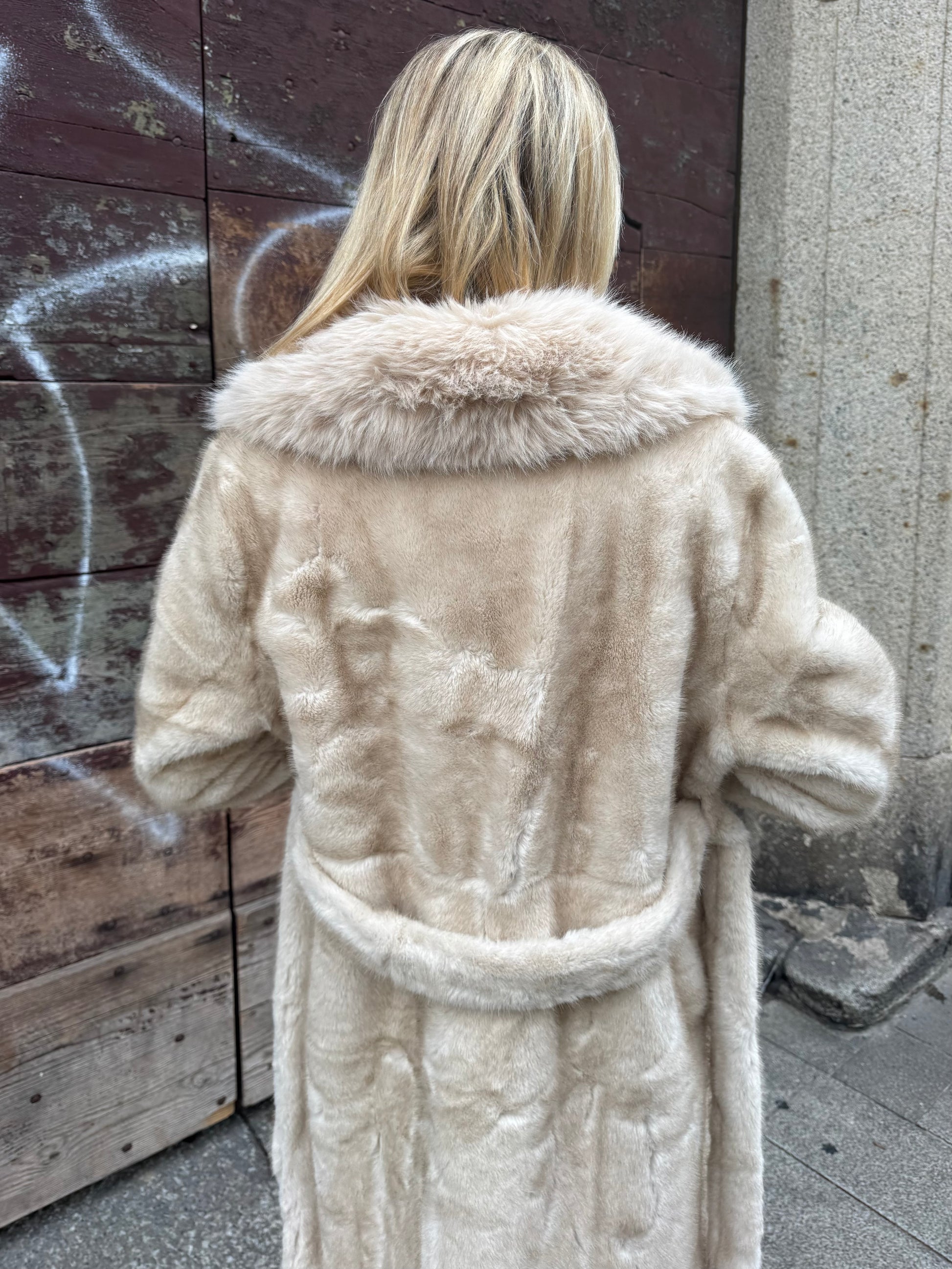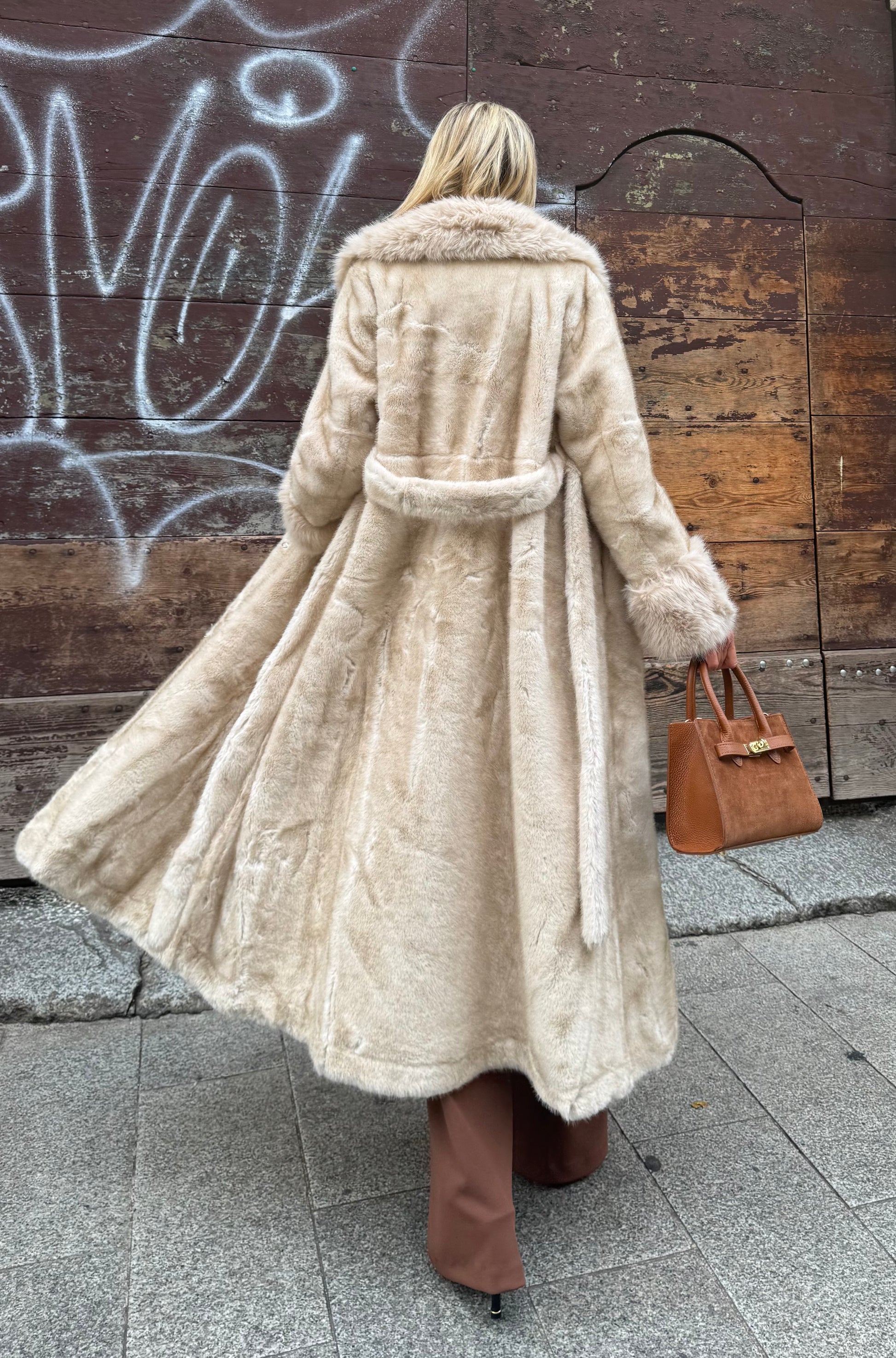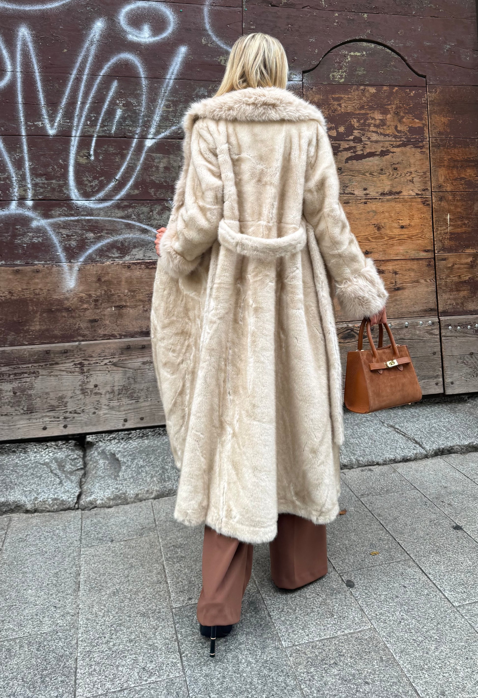 Ecopelliccia modello lungo e ampio, chiusura con ganci, cintura in vita