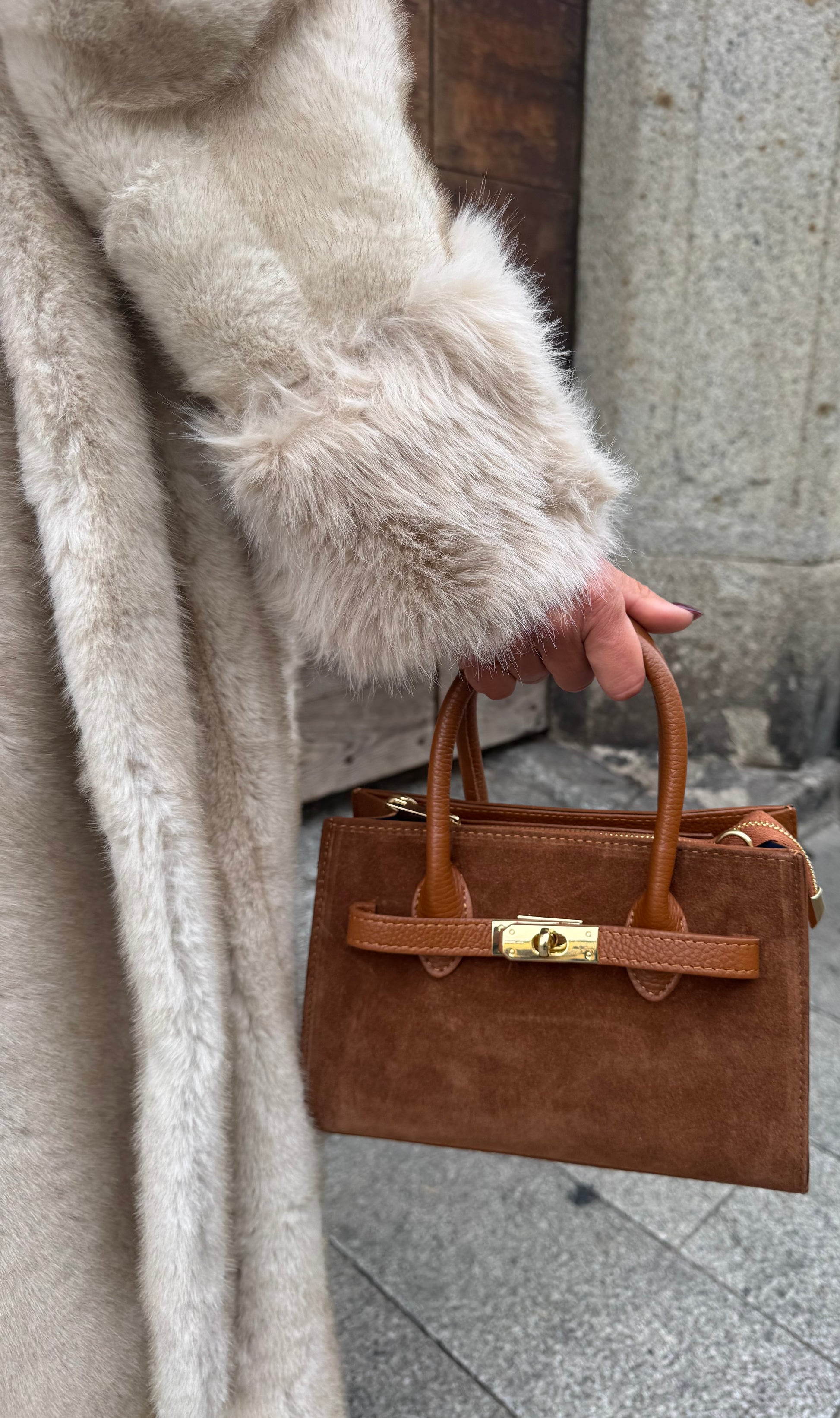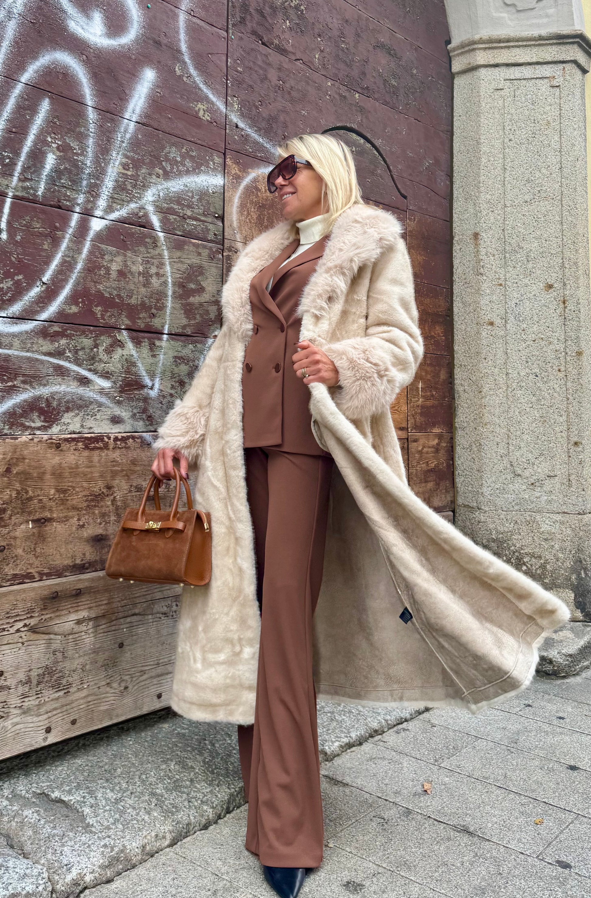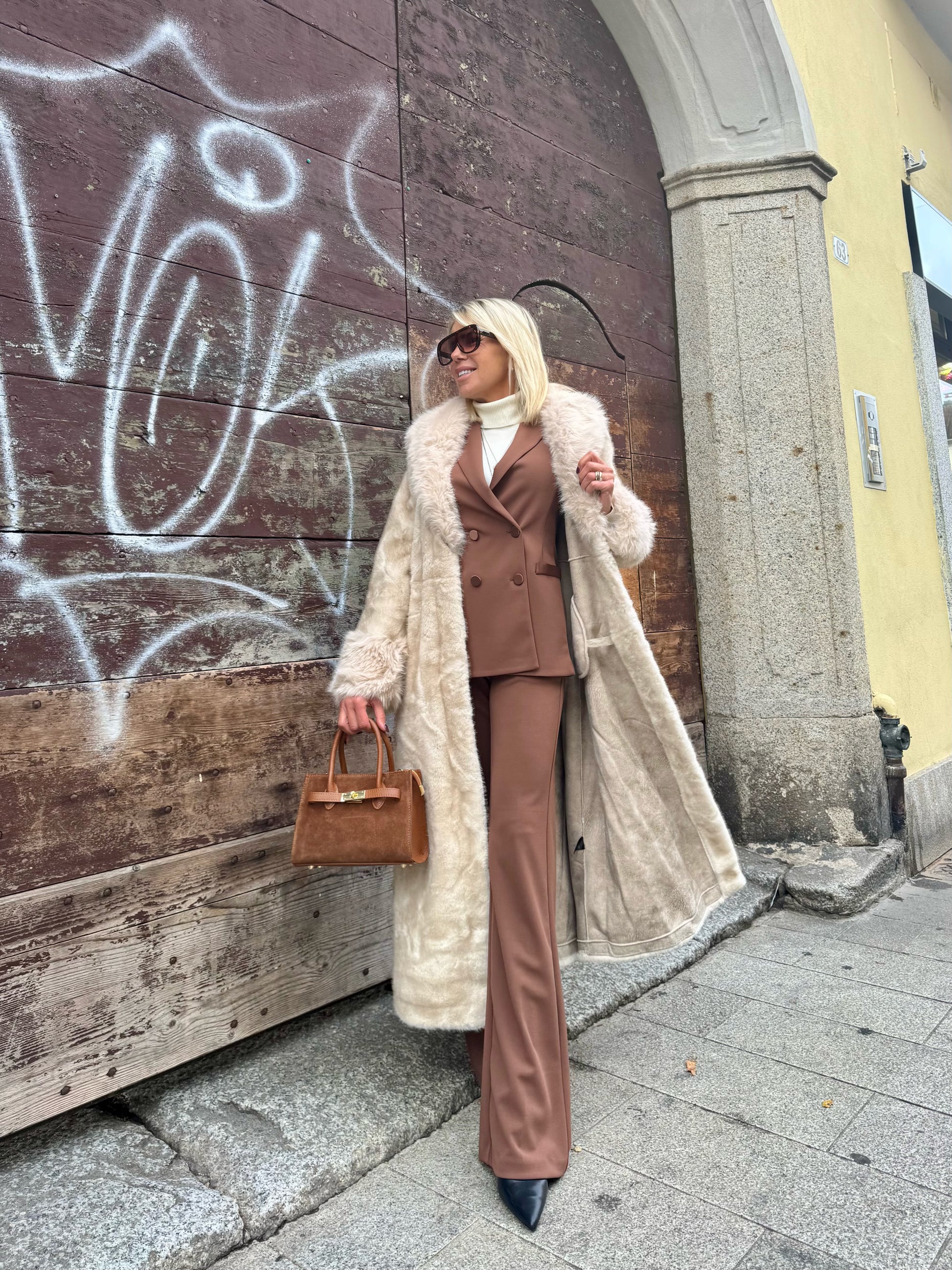 Ecopelliccia modello lungo e ampio, chiusura con ganci, cintura in vita