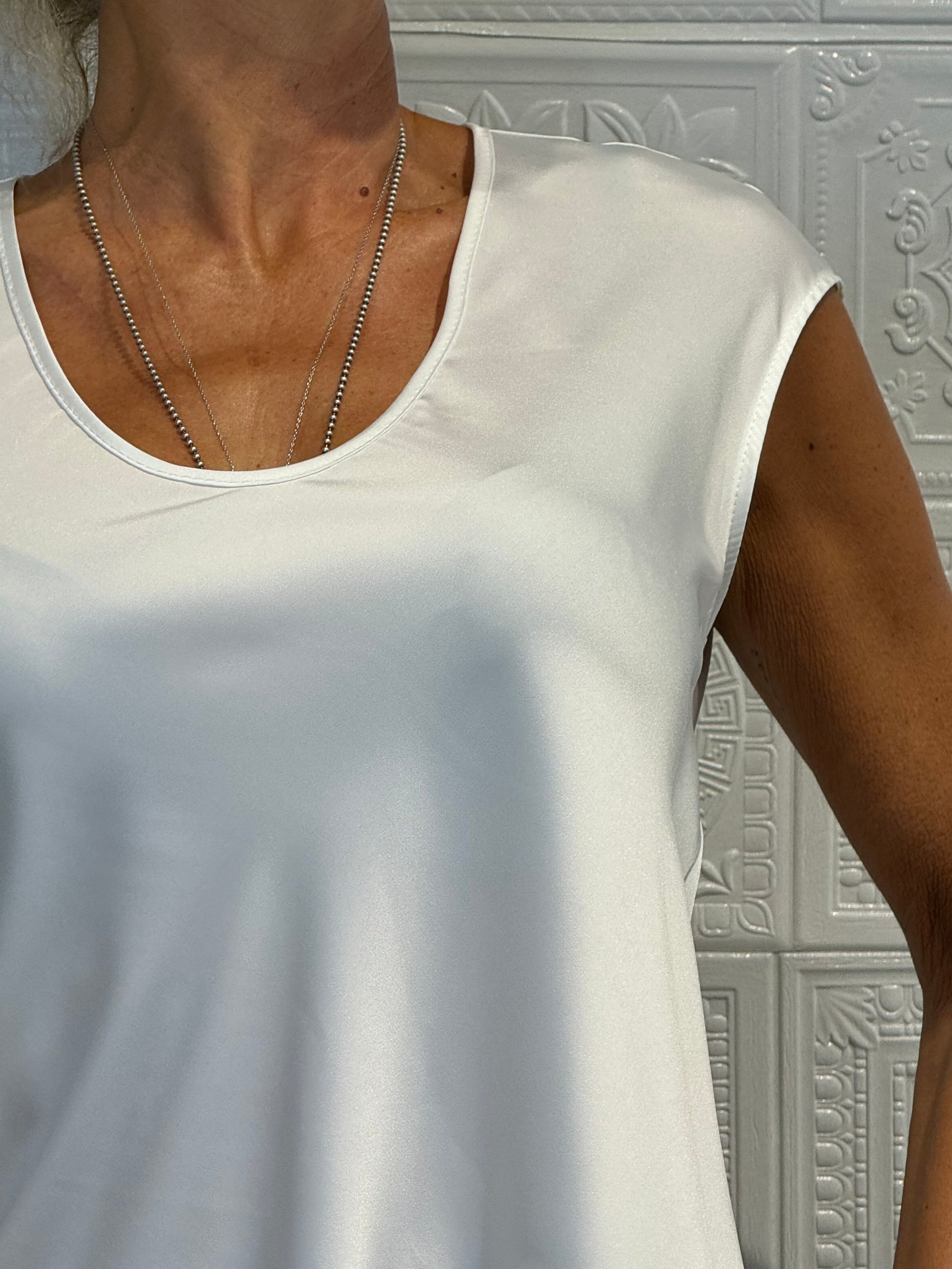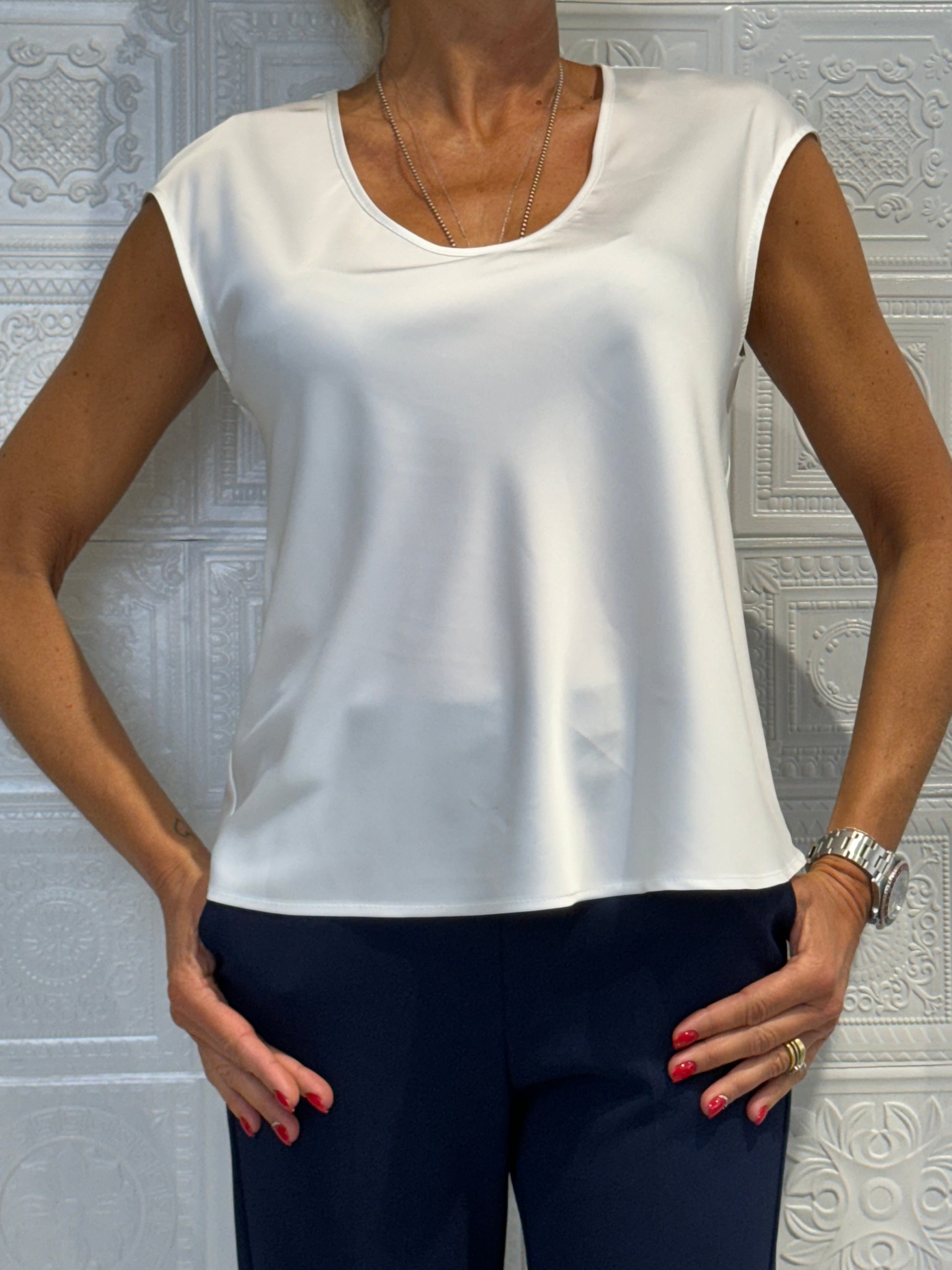 Un top in raso raffinato, caratterizzato da un design senza maniche e uno scollo a V che aggiunge un tocco di eleganza discreta. La sua vestibilità morbida lo rende ideale da abbinare a qualsiasi capo o anche da portare da solo.